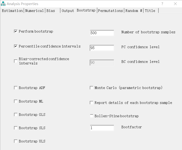 在Amos的分析菜单对Bootstrap选项进行设定和勾选,Perform bootstrap表示规定模型的测算次数,Percentile confidence intervals表示置信区间。本文中介效应设置了500次的测算次数和95%的置信区间