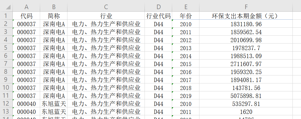 数据指标:代码、简称、行业、行业代码、年份、环保支出本期金额(元)