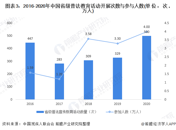 近年来,我国省级普法宣传教育活动开展次数整体上升,参与人数整体增长。2020年,全国县级以上人大开展《中华人民共和国残疾人保障法》执法检查和专题调研318次;政协开展视察和专题调研282次。全国开展省级普法宣传教育活动500多次,近40万人参加。