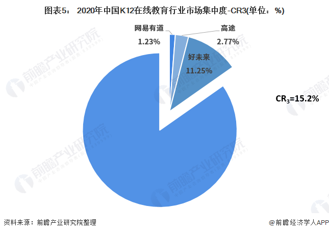 总体来看,我国K12在线教育行业的市场集中度较低,2020年,K12在线教育运营市场CR3 约为15.2%,主要是因为教育行业具有高度的分散属性,与其他的行业相比集中度偏低。