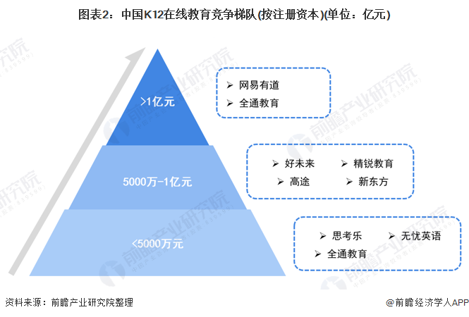 K12在线教育行业依据企业的注册资本划分,可分为3个竞争梯队。其中,注册资本大于1亿元的企业有网易有道、全通教育;注册资本在5000万-1亿元之间的企业有:好未来、高途、精锐教育、新东方;其余企业的注册资本在100亿元以下。