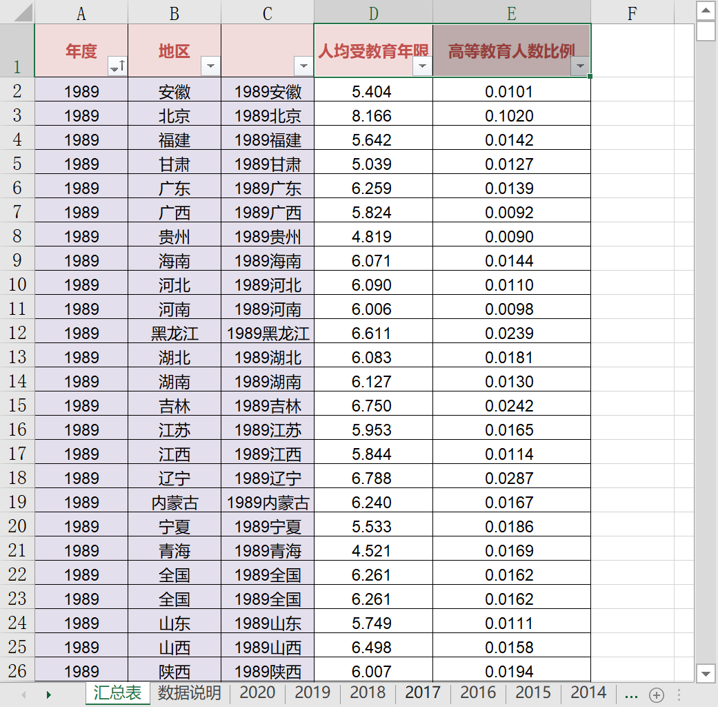 受教育年限与学历结构面板数据(1989-2020年) 各省市,包括以下两个数据