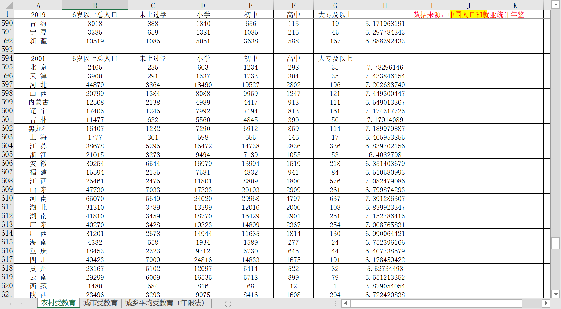 2、中国各省市城乡平均受教育年限(2000-2019)农村受教育情况、城市受教育情况(包括6岁以上人口、未上小学人数、初中、高中、大专及以上)、及以年限法计算的农村城镇平均受教育年限