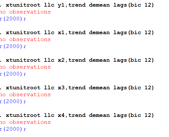 我已经设置过面板数据了 数据大致是这样的 都是数值型,并且我在没有做单位根检验前先试了一下固定效应随机效应这些回归也没有问题,但是我做单位根检验就出现这个 no obversation ,我用的是面板数据的单位根检验 没用时间序列的,请问这要怎么解决呀,我的时间是10年,10几家公司。