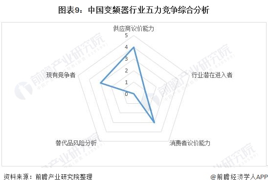 从五力竞争模型来看,我国变频器的发展主要受到上游原料价格水平的限制,行业内现有竞争者的威胁要来自外资品牌;行业整体同质化较严重,所以消费者的议价能力相对较强;潜在进入者方面,变频器行业本身的技术壁垒较高,进入者威胁较小;同时变频器作为工业发展必需品,目前暂无替代品对其造成威胁。根据以上分析,对各方面的竞争情况进行量化,1代表最大,0代表最小,目前我国变频器行业五力竞争总结如下: