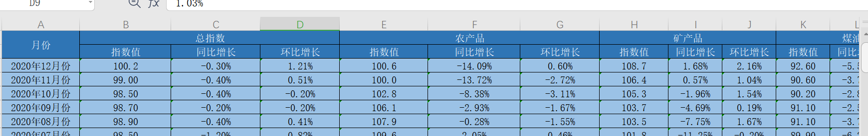 品、矿产品、煤油电的指数值、同比增长、环比增长