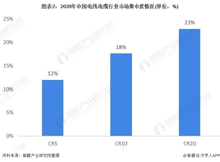 前瞻根据中国电线电缆行业销售规模,结合行业本土企业电线电缆产品销售收入进行分析,2020年,我国电线电缆行业CR5为12%,CR10为17.7%,CR20仅为22.9%,行业的市场集中度较低。