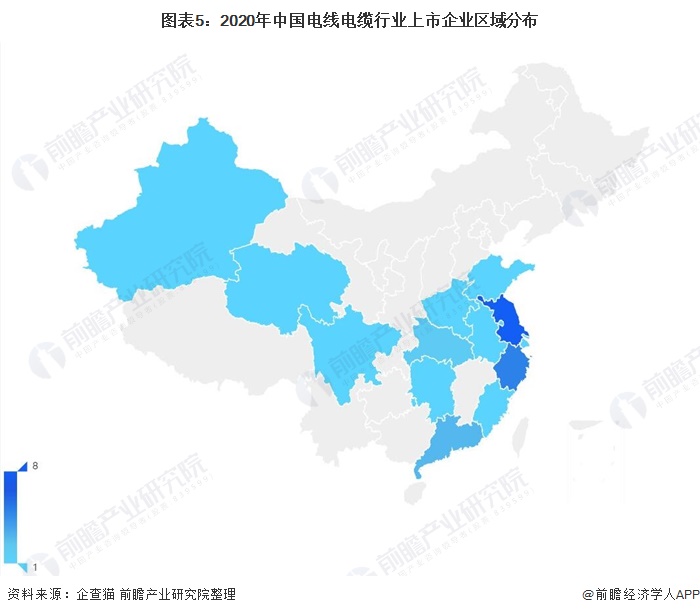 中国本土电线电缆行业企业众多,但主要以中小企业为主,这些公司大多分布在东南沿海地区,以江苏、浙江、广东省为主,同时目前行业中的上市公司数量相较于行业整体企业数量而言比重较少。