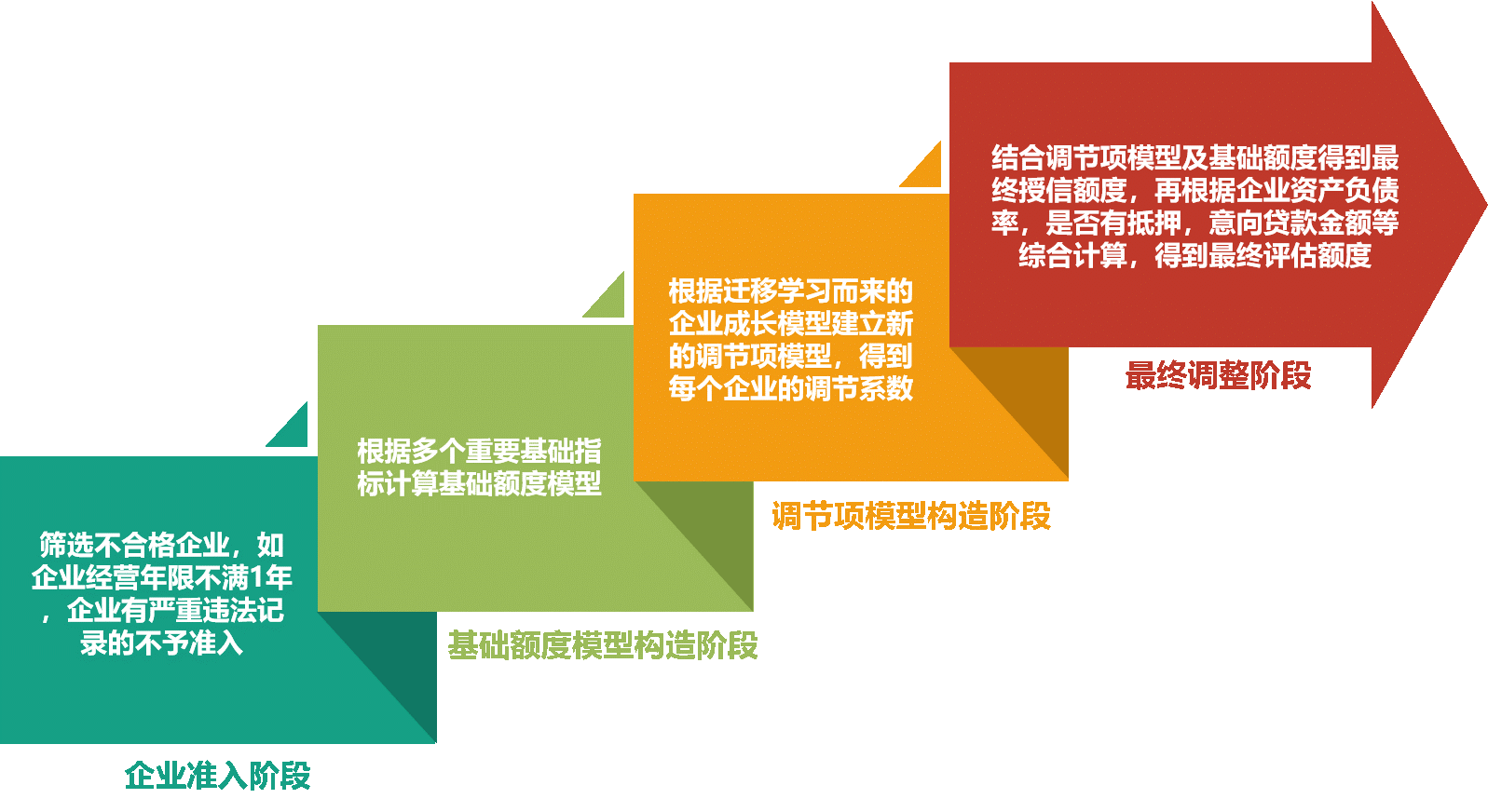 其中基础额度模型是选取最重要的几个指标所建立的模型,而调节项模型是通过迁移学习的方式迁移了企业成长力模型,再在企业成长力模型的基础上加以优化调节,使得模型更符合B银行的业务要求。其中调节优化包括: