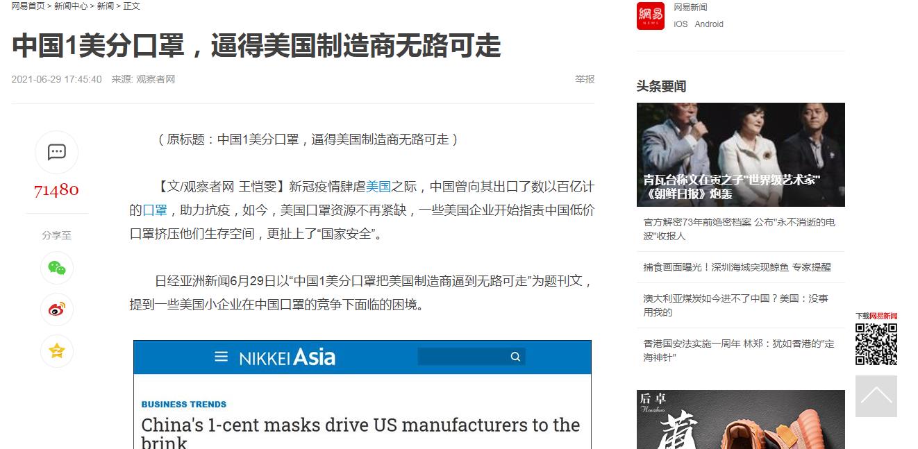 日经亚洲新闻6月29日以“中国1美分口罩把美国制造商逼到无路可走”为题刊文,提到一些美国小企业在中国口罩的竞争下面临的困境。