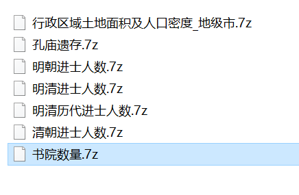 后者是儒家文化相关数据。包括明清进士数量、孔庙遗存数量、历史书院数量以及行政区域面积和人口密度(地市级)。