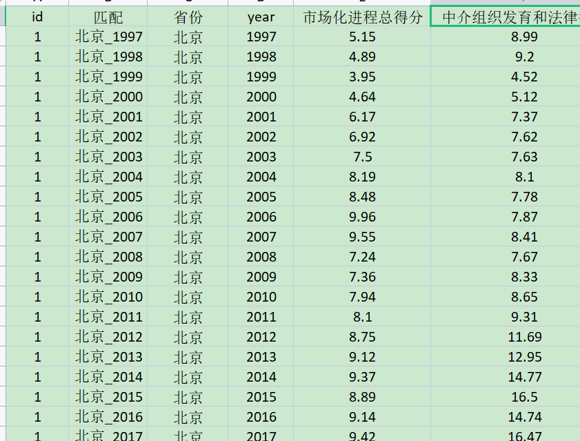 前者用的是樊刚(市场化指数总得分)和(中介组织和法律得分),时间跨度是1997-2019年(官方是到2016年,本人通过合理外推至2019年)