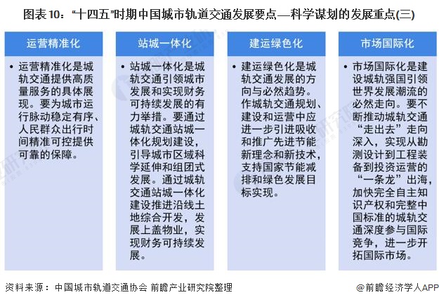 中国城市轨道交通协会在科学谋划发展要点上提出:技术智能化、装备自主化、网络功能化、发展持续化、行业标准化、区域差异化、制式多样化、运输协同化、运营精准化、站城一体化、建运绿色化、市场国际化。