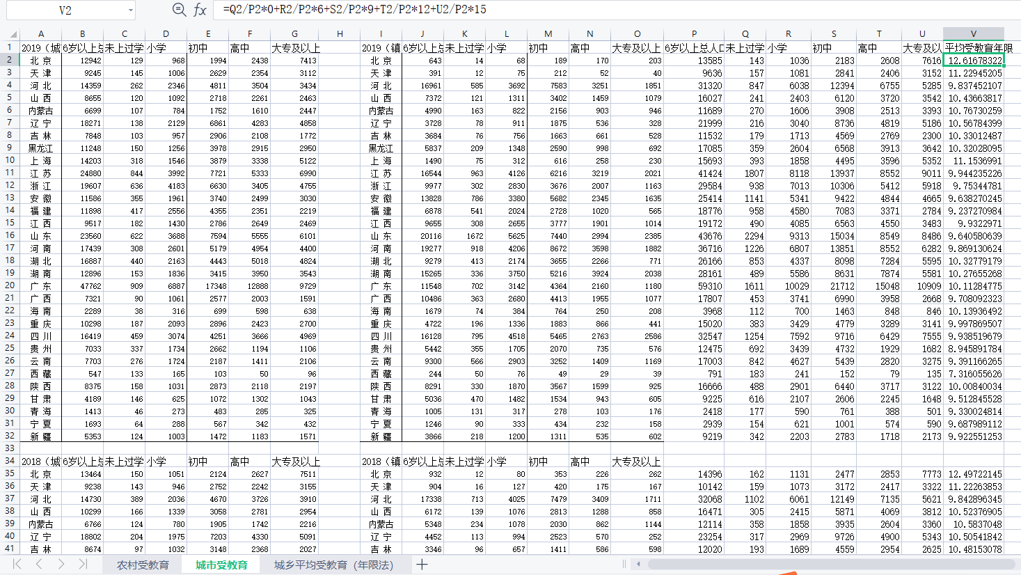 [3]平均受教育年限是将各种受教育程度折算成受教育年限计算平均数得出的,具体的折算标准是:小学=6年,初中=9年,高中=12年,大专及以上=16年。