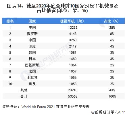 截止到2020年底,在世界前10国家现役军机数量排名中,美国以13232架军机数量位列全球第一,占比25%,成为军用飞机领域当之无愧的龙头;其次是俄罗斯共计4143架,占比8%;而中国共计3260架,占比仅有6%,对标美国等世界一流军队,我国军机增补空间较大。