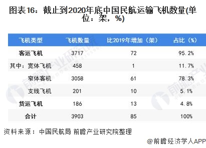 截至2020年底,中国民航全行业运输飞机期末在册架数3903架,比2019年底增加85架。其中客机共有3717架,占比95.2%;货机共有186架,占比4.8%。