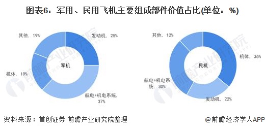 从飞机组成部件价值占比来看,军民飞机和民用飞机因用途不同,各组成部件价值占比差别较大。对于军机,航电+机电系统占比37%,发动机占比25%,机体结构占比19%;对于民机,机体结构占整机比重达到36%,动力系统次之,航电+机电系统占30%。
