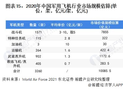 根据《World Air Force 2021》公布的2020年我国各类型军机机队数量,再结合行业平均单价初步估算2020年我国军用飞机行业的市场规模约有1万亿元。