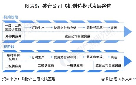 随着飞机零部件产品标准化、规模化要求提升,全球飞机制造中上游零部件配套都将逐渐由内部配套转向外部协作。参考波音公司的“主制造商-供应商”模式的演进如下: