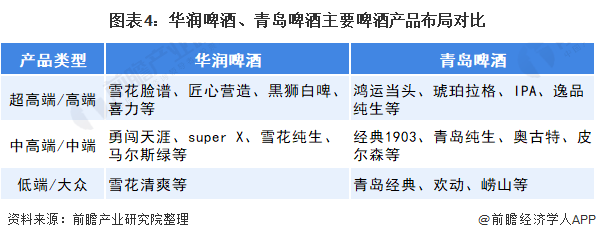 目前,啤酒行业企业纷纷布局中高端啤酒产品,华润啤酒和青岛啤酒在高、中、低几个档次均有产品布局。其中,华润啤酒推出黑狮白啤、喜力等系列产品打入高端市场;青岛啤酒凭借琥珀拉格、鸿运当头等高端产品保持住国内中高端市场竞争地位。