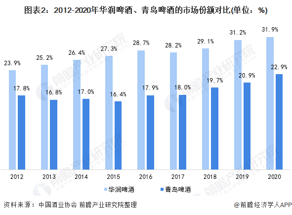 根据中国酒业协会披露的数据显示,2020年,华润啤酒、青岛啤酒的市场份额分别为31.9%和22.9%,在市场份额上,华润啤酒远超青岛啤酒。从历年的市场份额对比来看,华润啤酒始终保持着领先的优势地位。