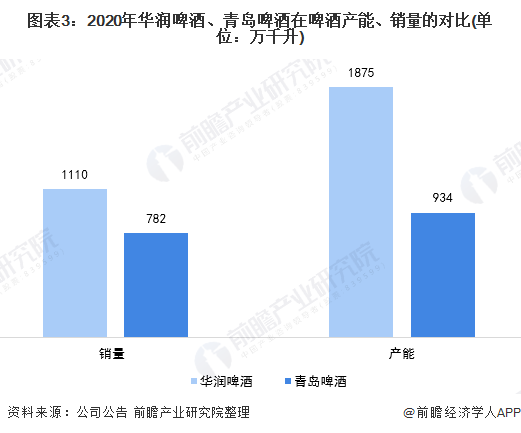 从啤酒产能来看,2020年华润啤酒年产能达到1875万千升,而青岛啤酒2020年实际产能仅为934万千升。从销量来看,2020年华润啤酒销量高达1110万千升,青岛啤酒2020年的销量为782万千升。可以看出,华润啤酒在啤酒规模上要领先青岛啤酒。
