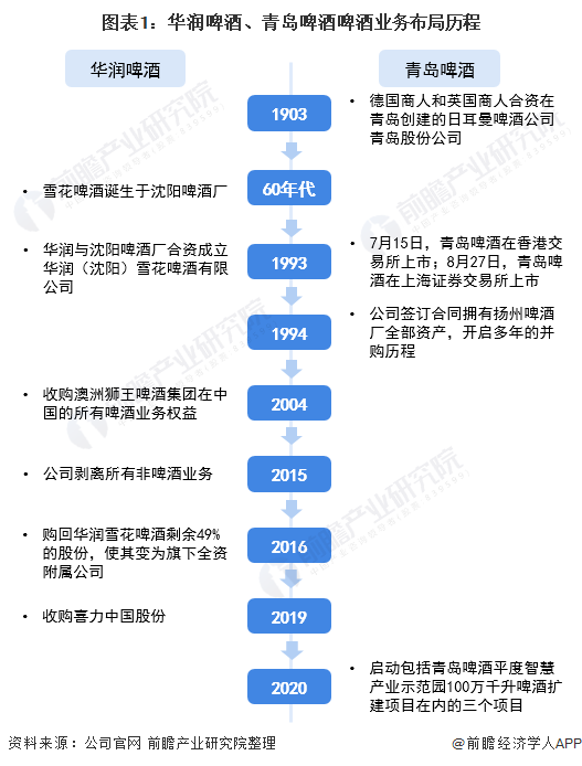 啤酒在酒精饮料行业中占据着重要的组成地位,我国是全球啤酒生产和消费大国。目前,中国啤酒行业的两大龙头企业分别是华润啤酒(00291.HK)、青岛啤酒(600600),两家企业在啤酒业务上的布局历程如下:
