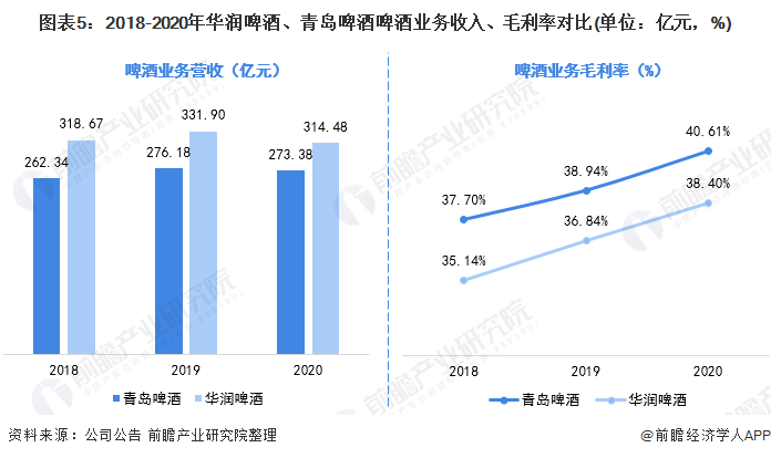 从啤酒业务的经营情况来看,2018-2020年,华润啤酒的啤酒业务收入领先于青岛啤酒。2020年,华润啤酒啤酒业务实现收入314.48亿元,青岛啤酒的啤酒业务实现收入273.38亿元。