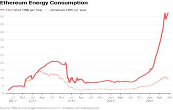其次,加密货币的发行会污染环境。区块链增长的方式众多,以比特币举例,需要工作量证明(POW)来获得记账权以参与写区块链账本的竞争,其中成功帮助验证区块链的节点(矿工)会获得帮助新区块营运的奖励金,这获得奖励的过程俗称挖矿(mining)。而整个“挖矿”行为实际上是利用电脑算力来进行数学运算,会耗费大量电力,进而污染环境。根据Digiconomist的评估:至2021年7月3日,预估比特币挖矿一年所耗费的电量相对于阿根廷一个国家一年耗费的电量,而以太坊对应的耗电量则相当于一个希腊。