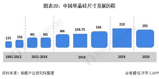 1981年—2012年:以100mm、125mm为主;2012年—2018年:以156mm(M0)、156.75mm(M2)为主;2019年,隆基以存量电池产线能接受的极限尺寸为逻辑,推出166mm(M6)硅片,比M2面积大出12.2%;同年中环参考半导体经验,继续推出210mm(M12,G12)硅片,表面积比M2硅片提升了80.5%;2020年七家企业联合发布标准尺寸倡议,提议将182mm(M10)硅片作为标准。
