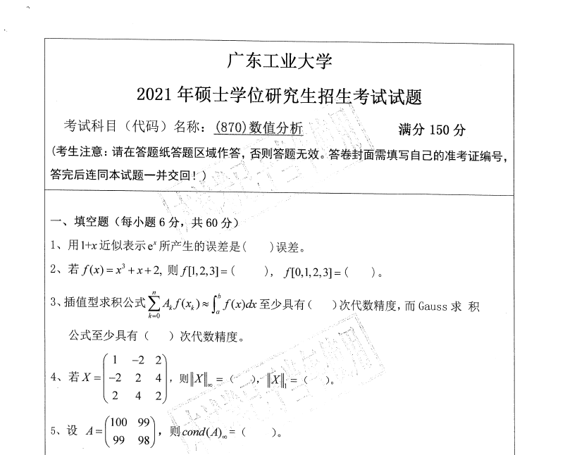 870 数值分析(广东工业大学2021年硕士学位研究生招生考试试题).rar
