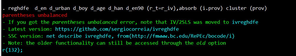 请使用ivreghdfe 来尝试这种带有工具变量的回归
