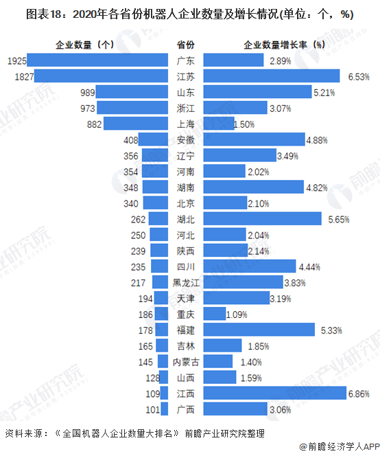 分省份来看,2020广东省机器人企业数量居全国首位,为1925家,较去年新增54家,增长率达到2.89%;其次是江苏省,企业数量为1827家,较去年新增112家,增长率达到了6.53%。