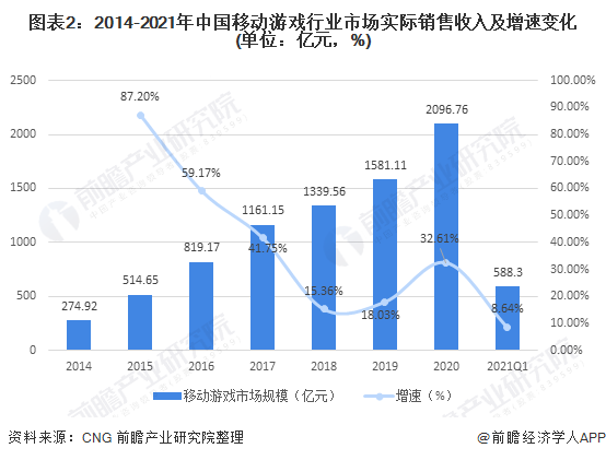游戏行业中移动游戏是主要的游戏类型,2014-2020年我国移动游戏行业市场规模从274.92亿元增长到了2096.76亿元,年均复合增长率高达40.3%。2021年第一季度移动游戏行业的市场规模为588.3亿元,较上年同期增长了8.64%。