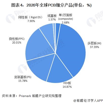 在当前PCB行业的细分市场中,为适应不同电子设备使用要求,PCB衍生出多种类型,不同产品类型在PCB产量中占有不同比例。根据Prismark发布的数据显示,2020年仍是多层板和挠性板占主导,二者分别占比为37.39%和20.01%。