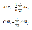 (4)得到事件样本中个股的异常收益后,要依次进行异常收益的横向平均和纵向求和,分别获得平均的异常收益(Average Abnormal Returns),和从第k天起累加的异常收益(Cumulative Abnormal Returns);