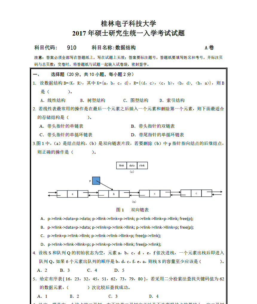 910 数据结构(桂林电子科技大学2017年硕士研究生统一入学考试试题).pdf