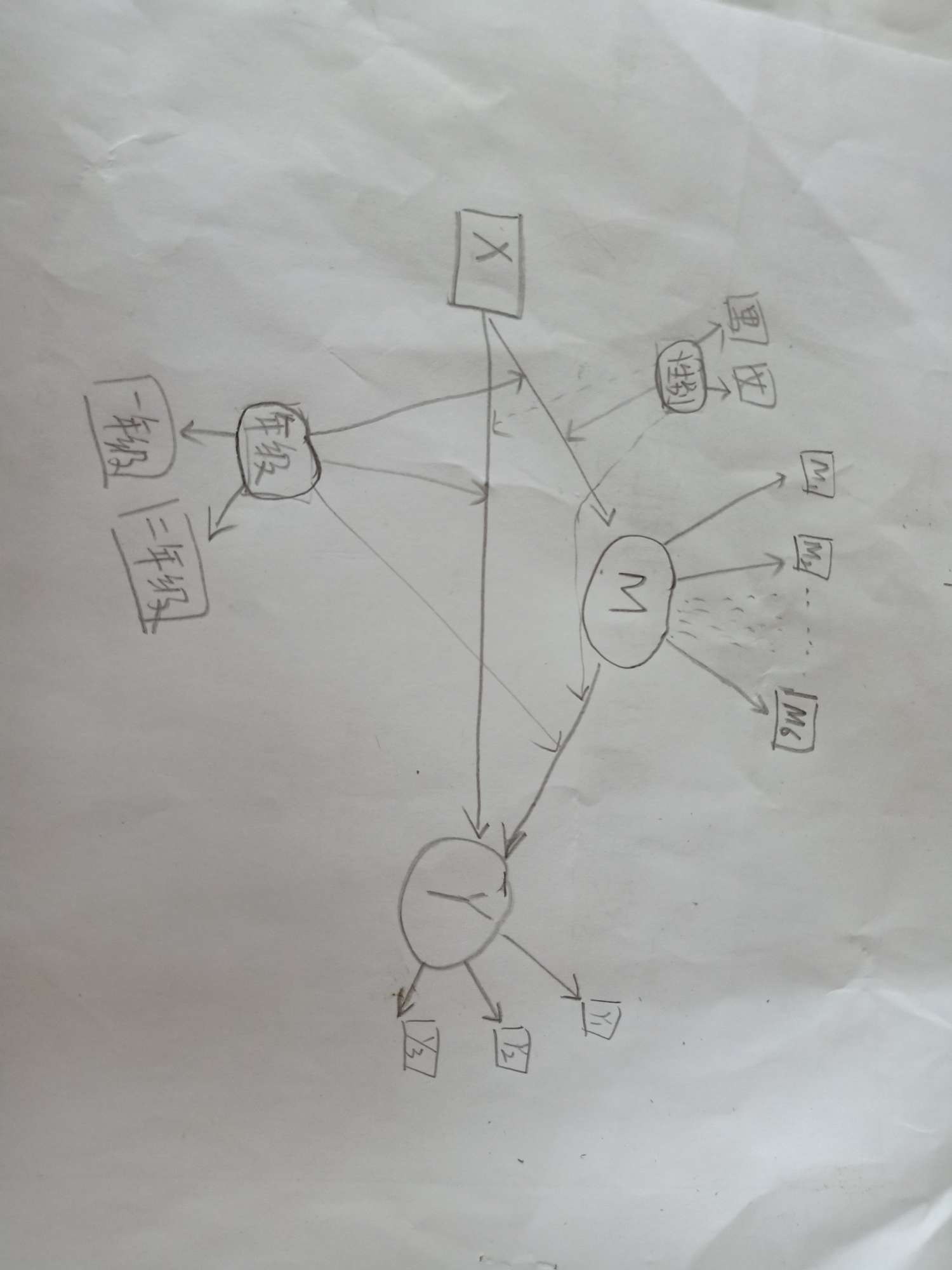 急救:换一种问法,如果能写出这个步骤的也可以悬赏:目前我的一个模型找不到原型发表的论文,请各位大神指导一下(需要mplus或process统计分析):X是连续变量,中介变量M(M1---M6六个维度变量),因变量Y(Y1---Y3三个维度),有性别sex(男女)和年级(1,2两个年级)两个调节变量,<br>