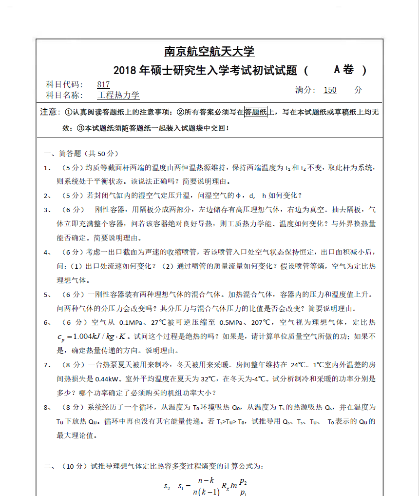 817 工程热力学(南京航空航天大学2018年硕士研究生入学考试初试试题).pdf