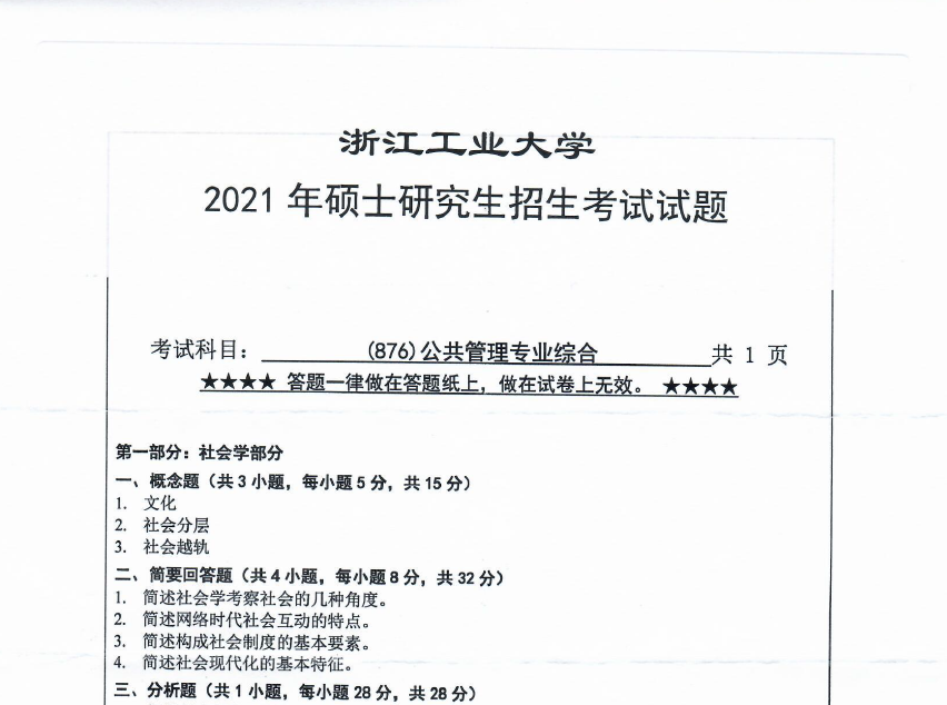 876 公共管理专业综合(浙江工业大学2021年硕士研究生招生考试试题).pdf