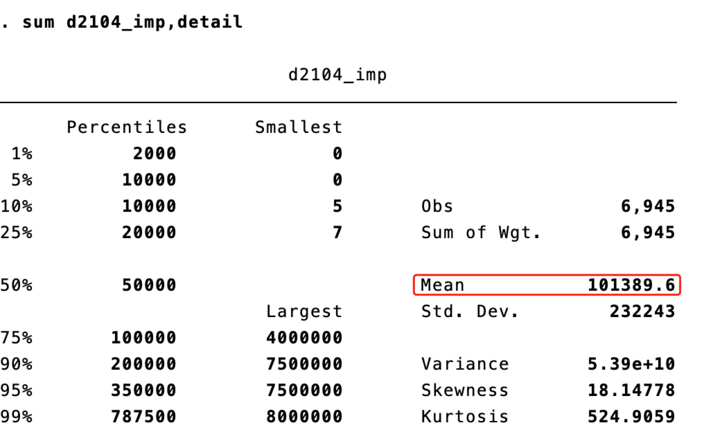 如题,我在阅读文献《中国家庭金融投资组合的风险——过于保守还是过于冒进》时,看到有如下图(表3)具体列出了不同年度资产配置的结构,但自己在进行统计时发现得出的数据与文献中列出的有巨大差异,因此想请教大家,可能是什么问题导致的?我自己的代码如下所示,只是做了最基本的sum统计,结果(下图)显示均值约10万元左右,之后也加入了权重,并进行了缩尾处理,但结果也是在9万附近,与文献中的16980元差距甚大。由于两个结果差异巨大,我觉得应该是操作上忽略了什么步骤或者是某些地方理解错了,还请大家指出~非常感谢!