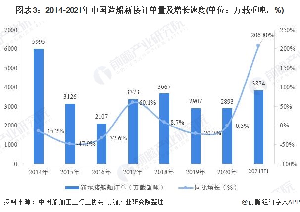 2021年上半年,全国造船新接订单量为3824万载重吨,同比增长206.8%,半年新接订单量已超过近六年全年接单量。