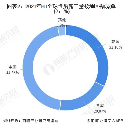 据克拉克松研究公司统计数据显示,2021年上半年,全球造船完工量为4663万载重吨,其中中国造船完成量为2092载重吨,占全球总完工量的44.86%;韩国造船完工量为1497万载重吨,占全球总完工量的32.10%,日本造船完工量为936万载重吨,占全球总完工量的20.07%。