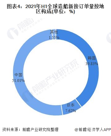据克拉克松研究公司统计数据显示,2021年上半年,全球造船新接订单量为7497万载重吨,其中中国造船新接订单量为3824载重吨,占全球总新接订单量的51.01%;韩国造船新接订单量为2986万载重吨,占全球总新接订单量的39.83%,日本造船新接订单量为571万载重吨,占全球总新接订单量的7.62%。