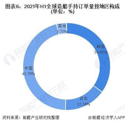 2021年上半年,全球造船手持订单量为18913万载重吨,其中中国造船手持订单量为8660载重吨,占全球总手持订单量的45.79%;韩国造船手持订单量为6601万载重 吨,占全球总手持订单量的34.90%,日本造船手持订单量为2943万载重吨,占全球总手持订单量的15.56%。