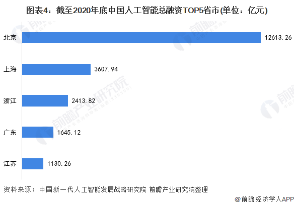 从省市分布来看,我国人工智能行业融资主要分布在北京、上海、浙江、广东和江苏等发达地区。其中,北京人工智能行业总融资最多,达到12613.26亿元;上海总融资3607.94亿元;浙江、广东、江苏总融资分别为2414.82亿元、1645.12亿元和1130.26亿元。