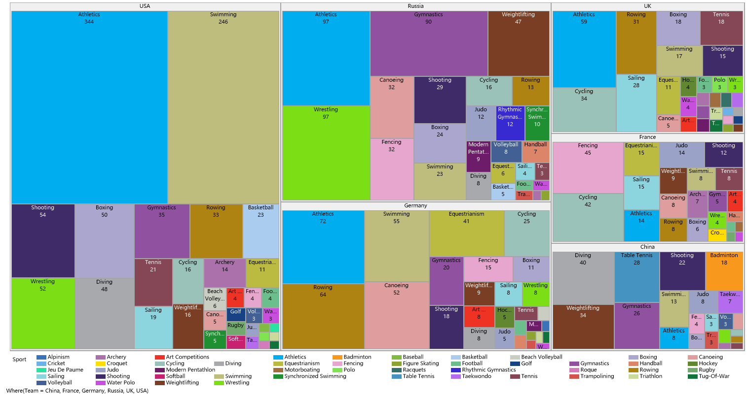 从图-6的覆盖面积看,最名副其实的当属中国跳水梦之队,几乎可以包揽每届奥运会所有跳水项目的金银牌。举重和国乓紧随其后,但这两个项目终究少了点影响力,特别是国乓,纵然天下无敌,但或多或少愈发孤芳自赏。此外,体操,射击、羽毛球等,中国也都是名将辈出。显而易见地是,相较于欧美体育列强侧重制霸田泳(图-7),中国的传统优势项目更偏技巧型一些。