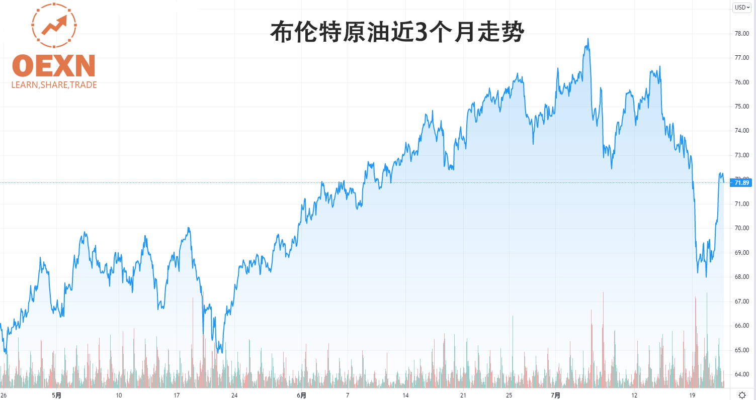 OEXN报道:美东时间周三(7月21日)国际油价收涨,今年4月以来首次涨超4%,其中纽商所9月交货的轻质原油上涨4.61%,收于每桶70.3美元;伦敦布伦特原油期货涨幅则涨超4.15%,收于72.23美元/桶。