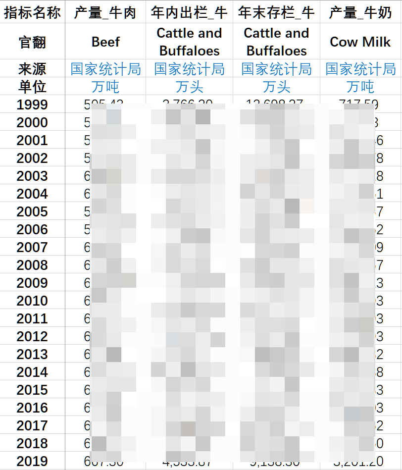 全国畜产品产量、出栏量、存栏量:牛(1999-2019).xlsx