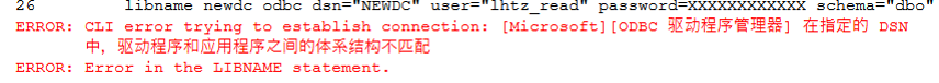 libname newdc odbc dsn="NEWDC" user="lhtz_read" password='SwRead7718' schema="dbo" readbuff=32767;